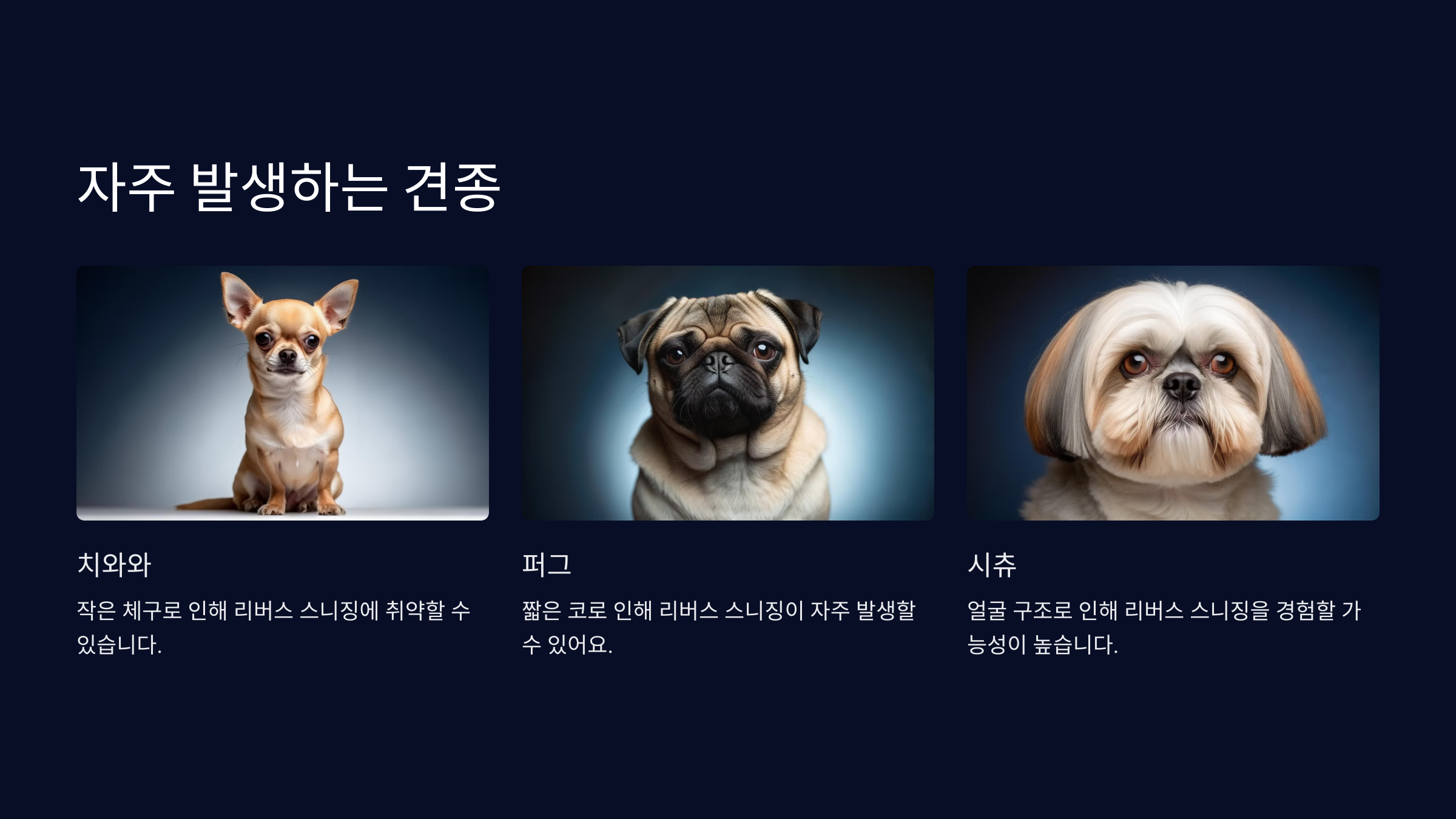 보통 작은 견종이나 단두종(코가 짧은 강아지)에서 더 자주 발생하는 경향이 있어요. 특히 치와와, 퍼그, 시츄 같은 견종이 리버스 스니징을 겪는 경우가 많답니다.