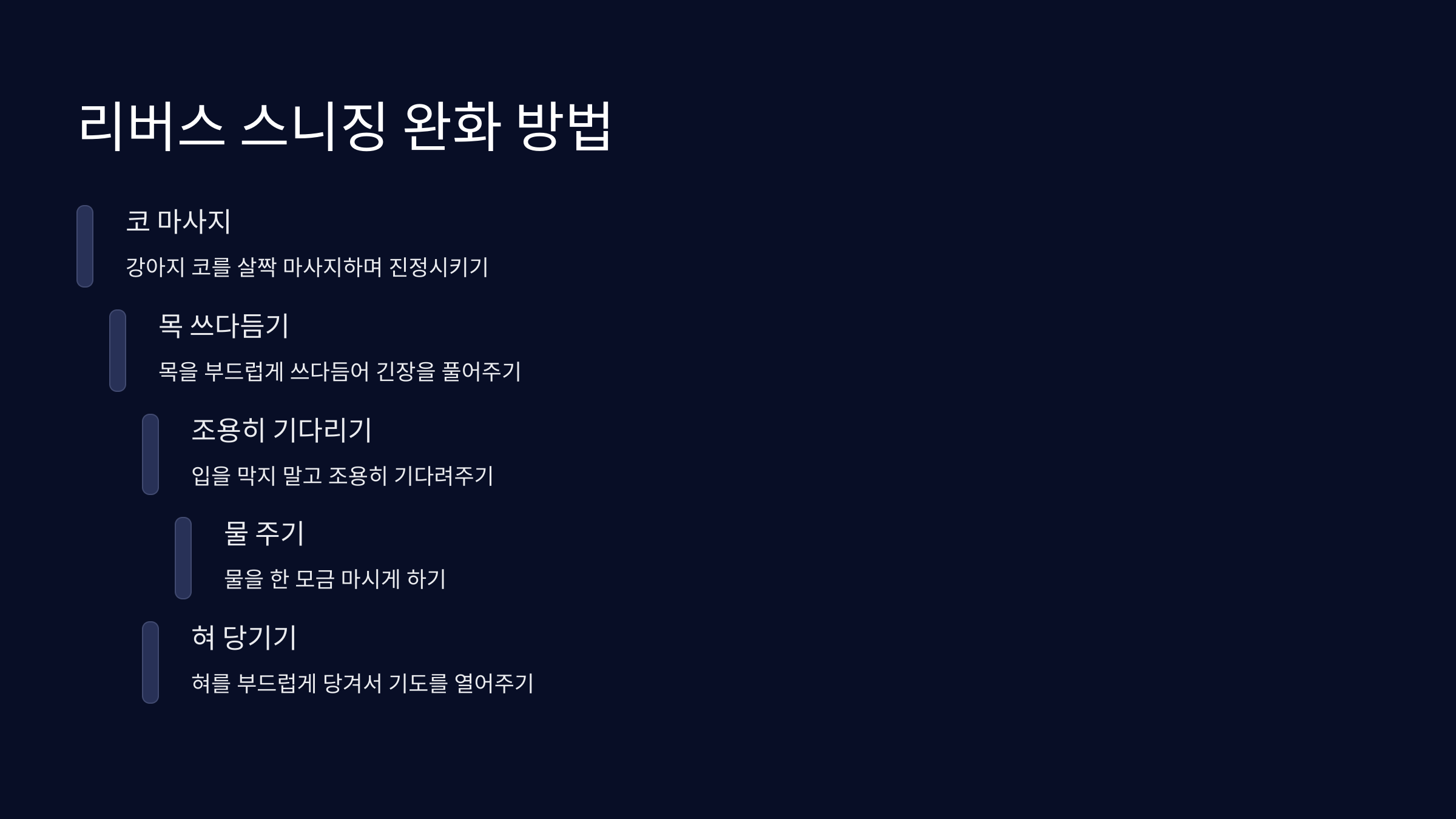 - 목을 부드럽게 쓰다듬어 긴장을 풀어주기