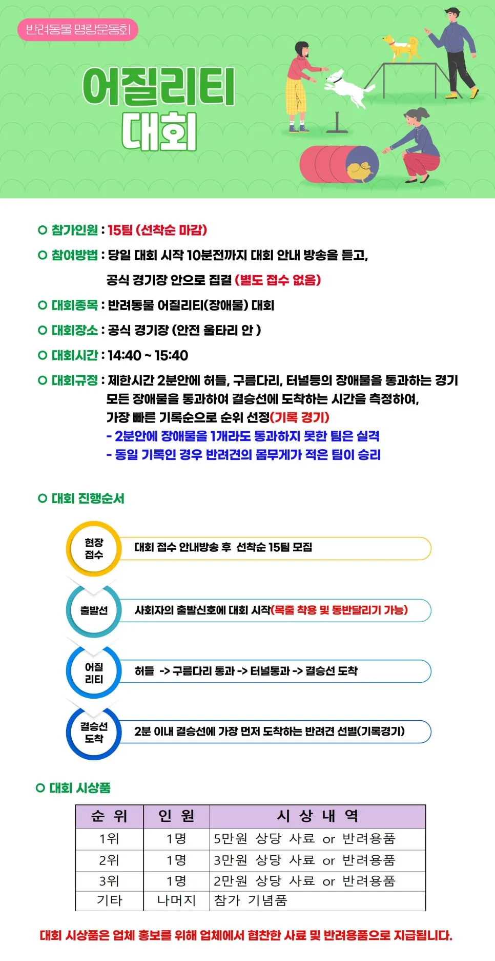 이러한 경기를 통해 반려동물의 운동 능력을 향상시키고, 보호자와 함께 성취감을 나눌 수 있는 기회를 마련합니다.