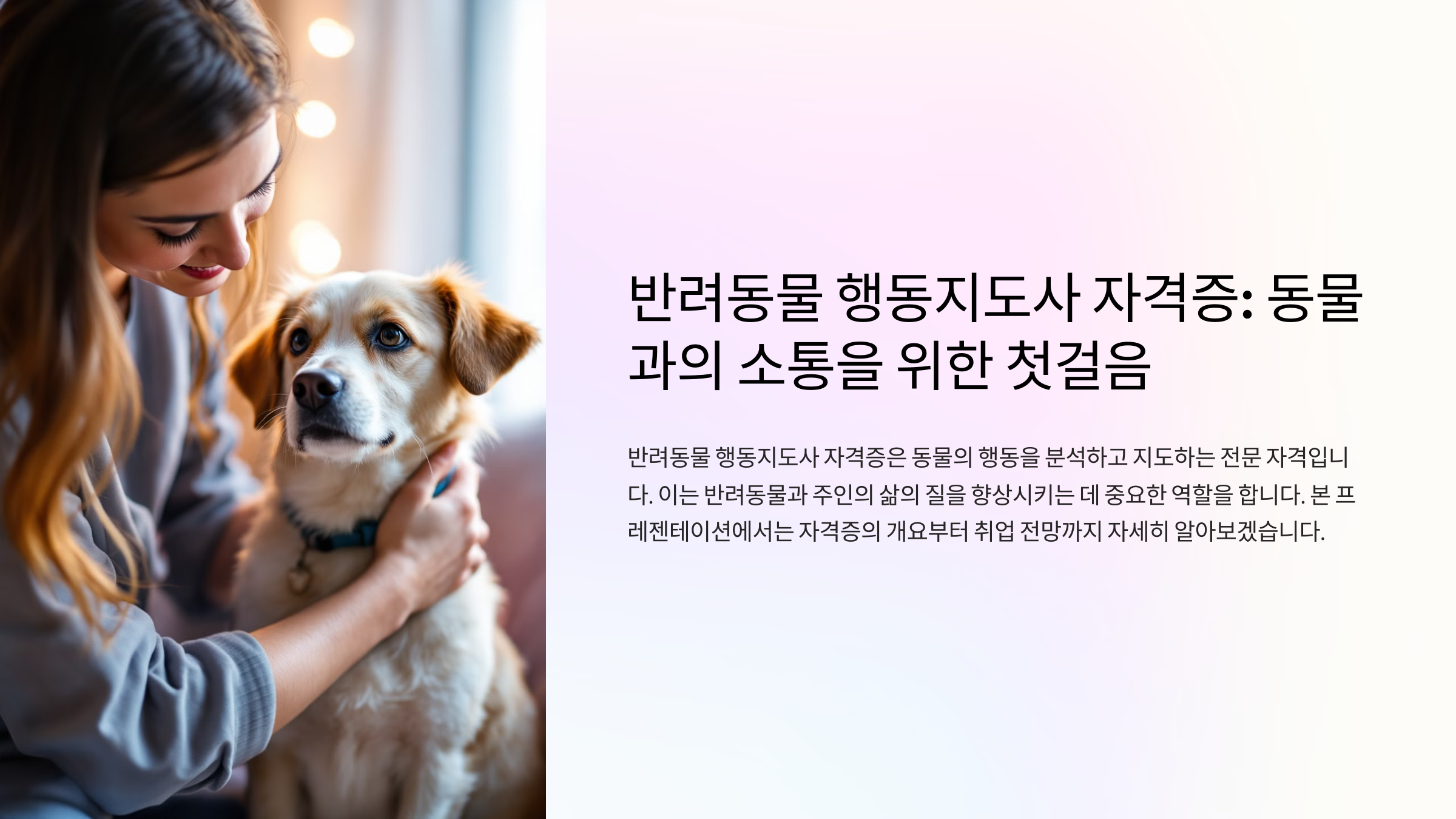 반려동물 행동지도사 자격증은 반려동물의 행동을 분석하고 문제를 교정하는 기술을 배워 동물과 주인의 삶의 질을 향상시키는 데 기여하는 전문 자격입니다. 반려동물 산업이 성장하면서 수요가 증가하는 이 자격증은 관련 분야에서 높은 신뢰를 받으며, 보호자와 반려동물 간의 원활한 소통과 조화를 돕는 데 중요한 역할을 합니다. 이번 글에서는 반려동물 행동지도사가 무엇인지, 자격증의 필요성과 장점, 그리고 취업 전망까지 자세히 알아보겠습니다.