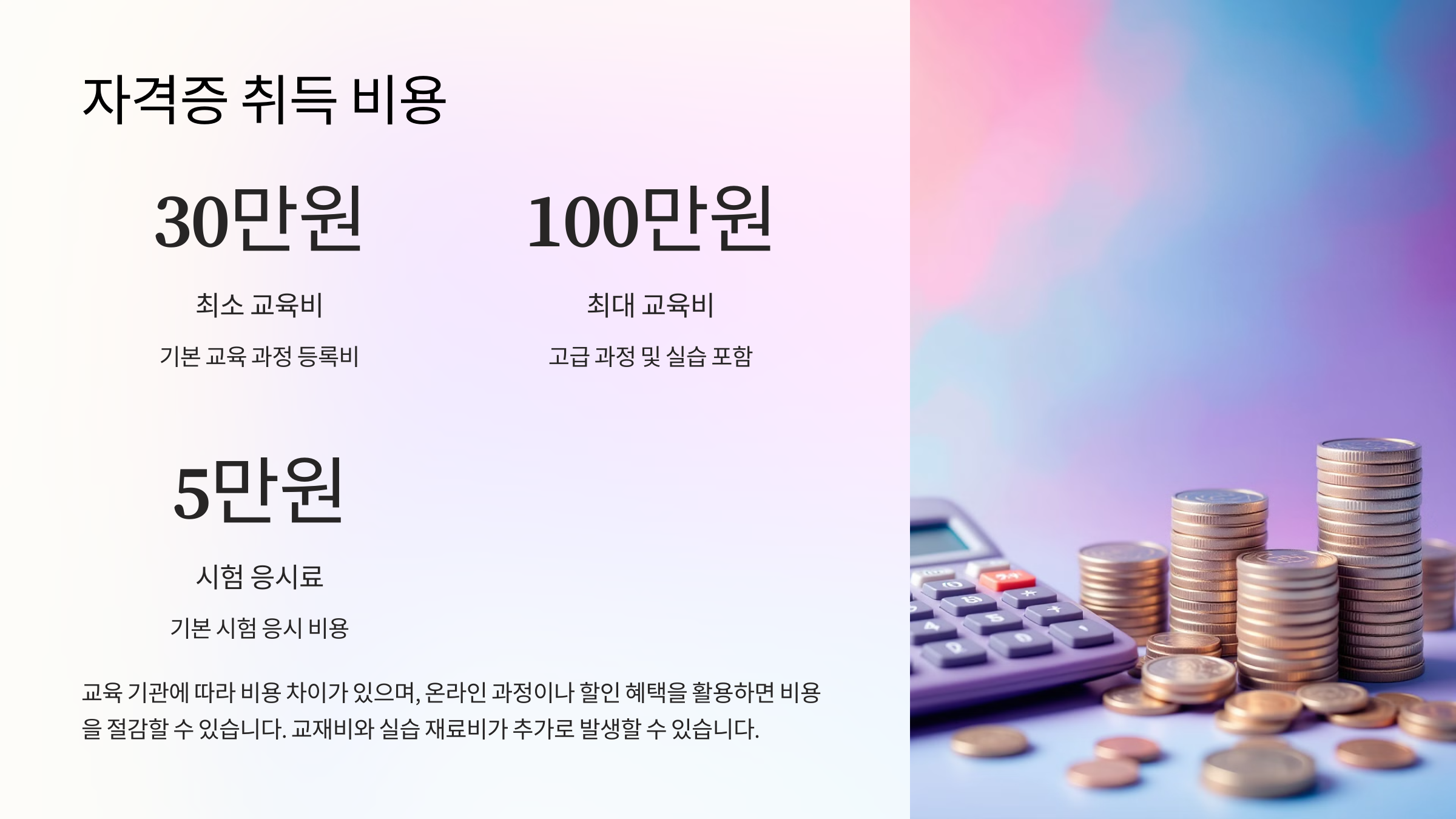 - 교육 과정 등록비: 교육 기관에 따라 30만 원에서 100만 원 사이로 다양합니다.