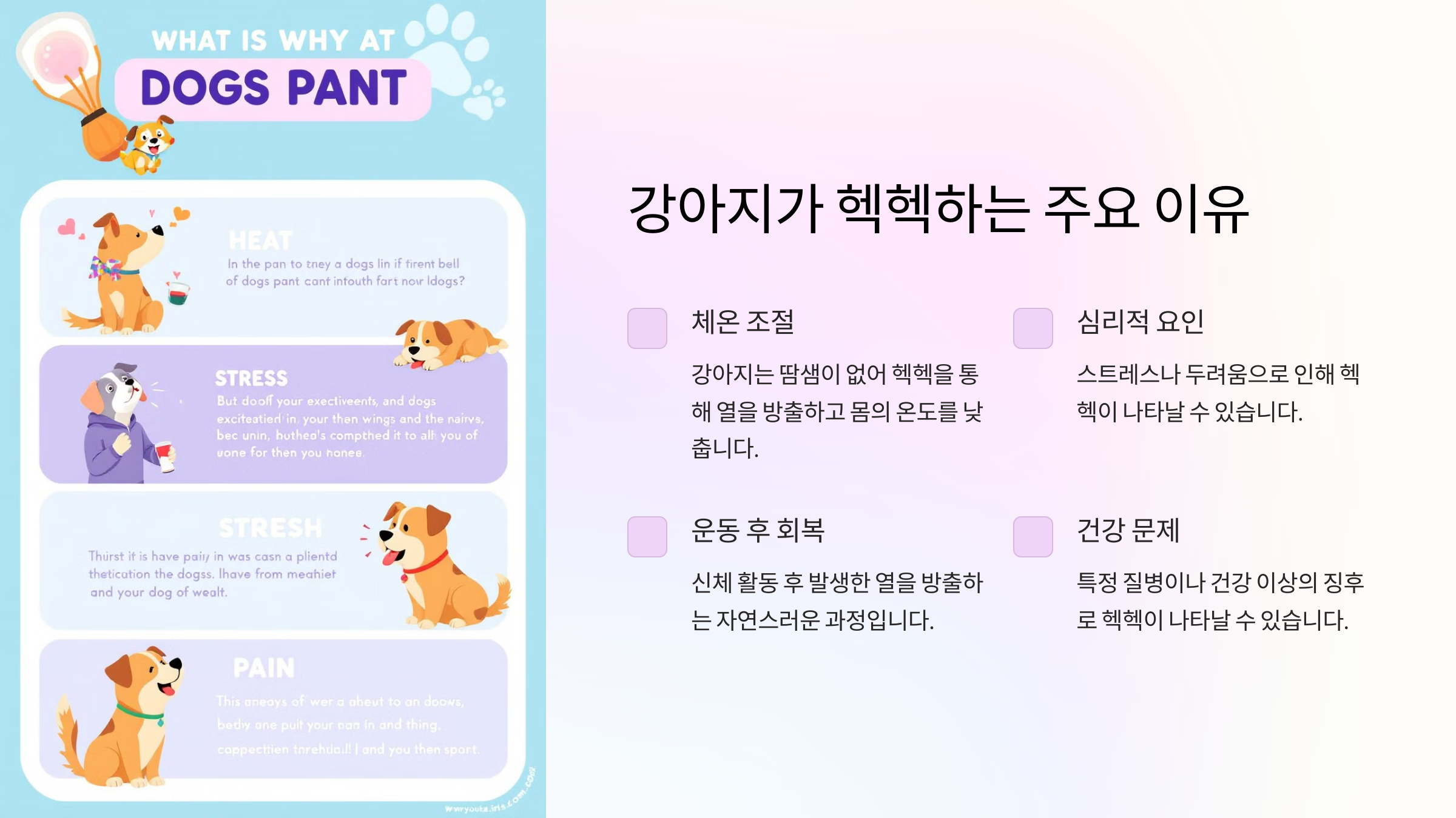 강아지가 헥헥하는 이유는 단순히 체온 조절에 국한되지 않으며, 다양한 생리적, 심리적 요인과 연관되어 있습니다. 아래는 주요 이유를 정리한 내용입니다.