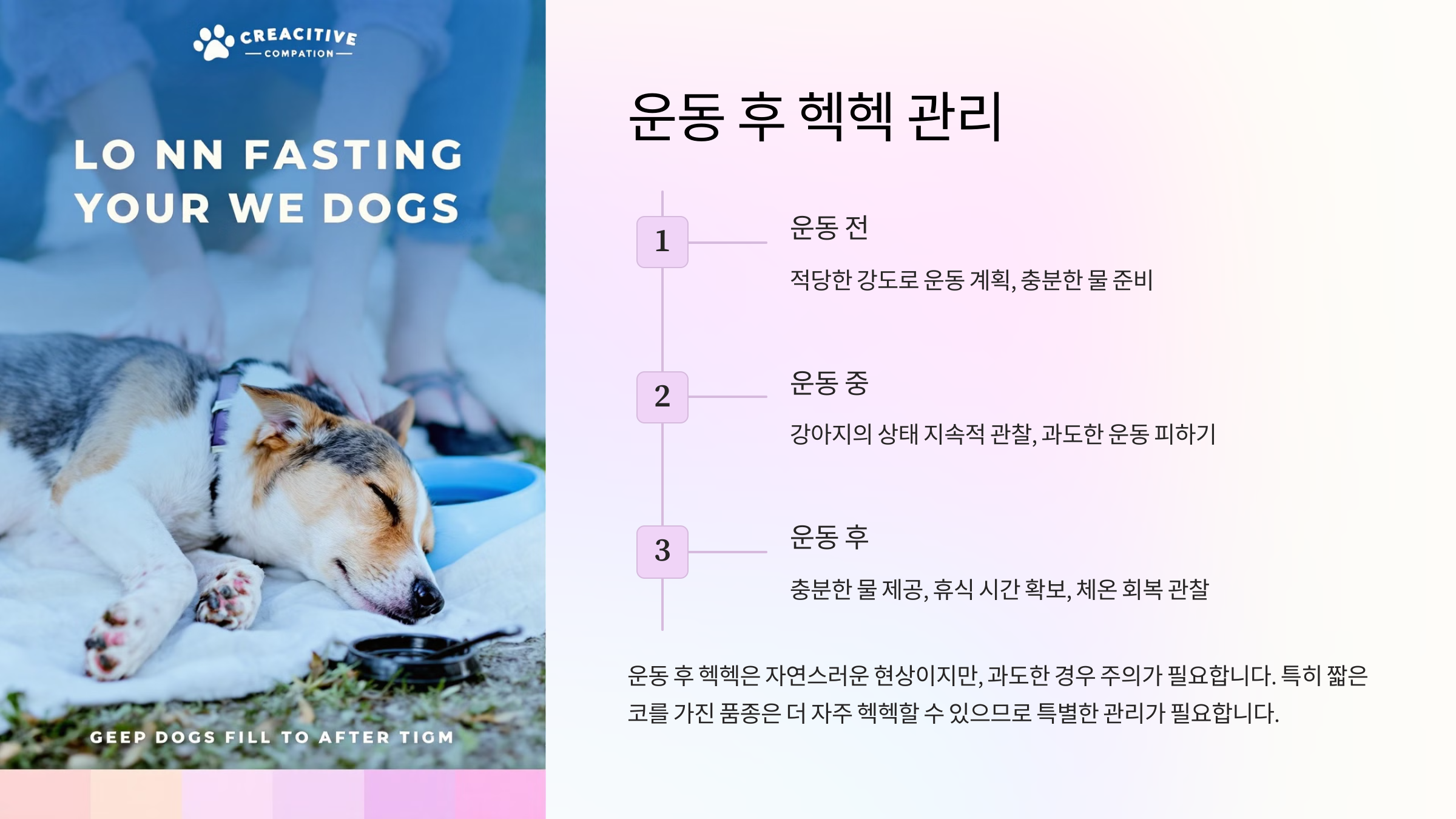 강아지가 운동 후 헥헥을 하는 것은 일반적인 생리적 반응입니다. 그러나 운동량, 품종, 체력 등을 고려한 적절한 관리가 필요합니다.
