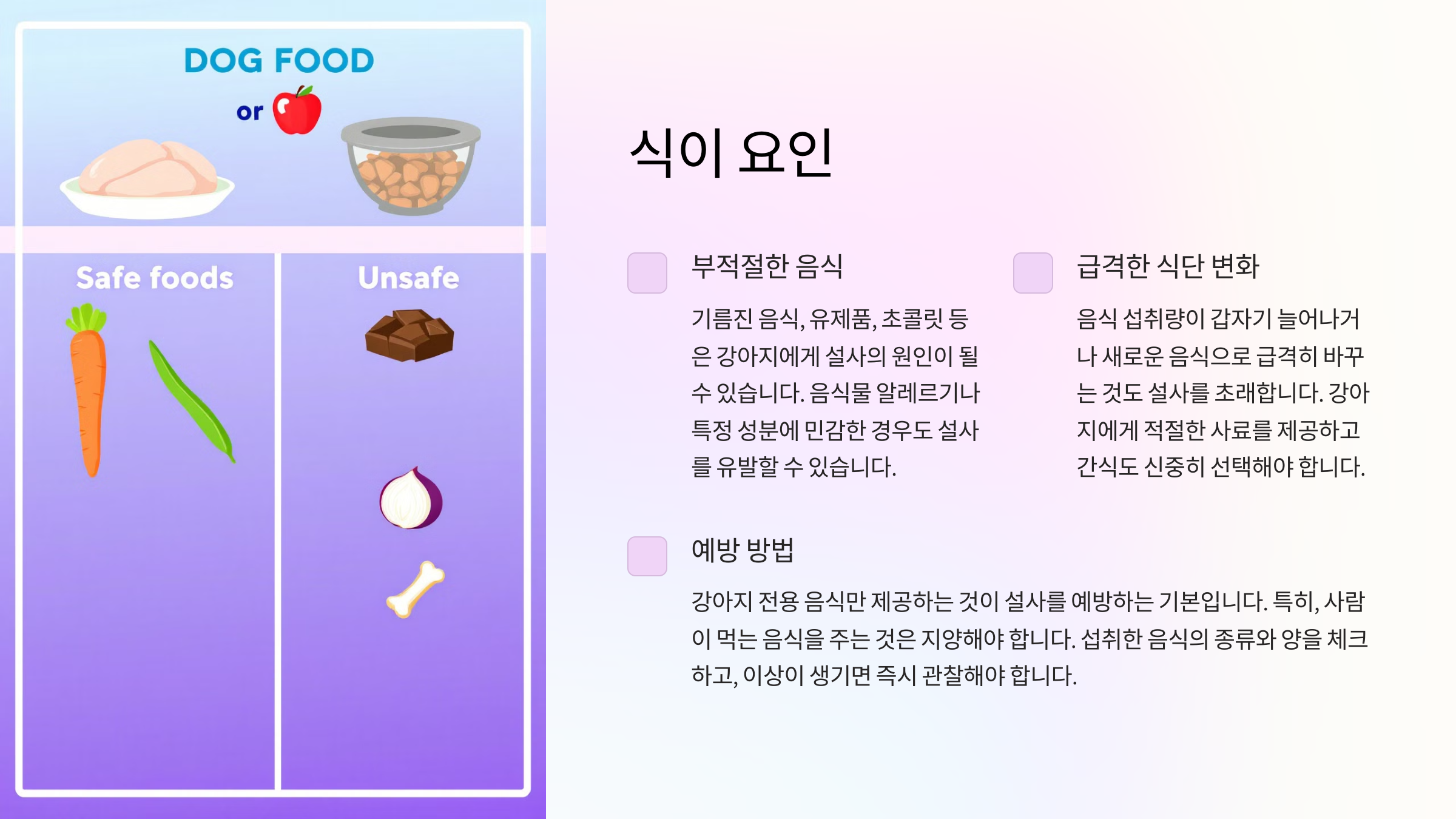 강아지가 낯선 음식을 먹어야 하는 상황이라면 반드시 수의사와 상담한 후에 시도해야 합니다. 이는 특정 성분이 알레르기를 유발할 가능성을 줄이는 데 도움을 줍니다. 또한, 정기적인 건강검진과 식단 점검을 통해 강아지의 전반적인 건강 상태를 체계적으로 관리하세요. 설사 증상이 발생했을 때는 빠르게 원인을 파악하고 적절히 대처하는 것이 중요합니다.
