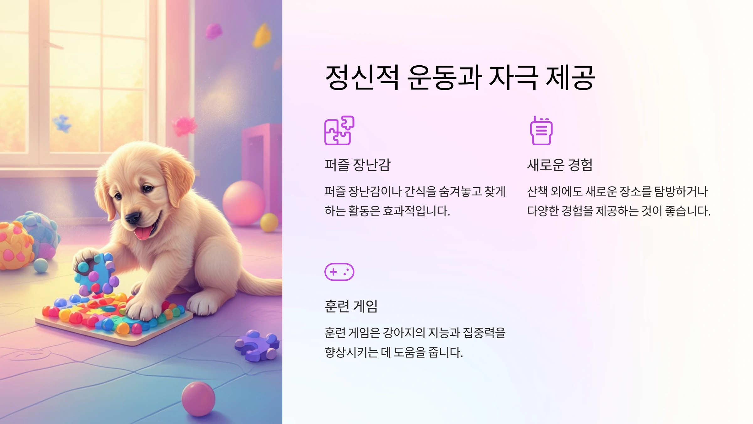 훈련 게임 역시 매우 유용합니다. 예를 들어, "앉아", "기다려", "찾아"와 같은 명령어를 가르치면서 간식을 보상으로 제공하는 훈련은 강아지의 집중력과 지능을 동시에 향상시킵니다.