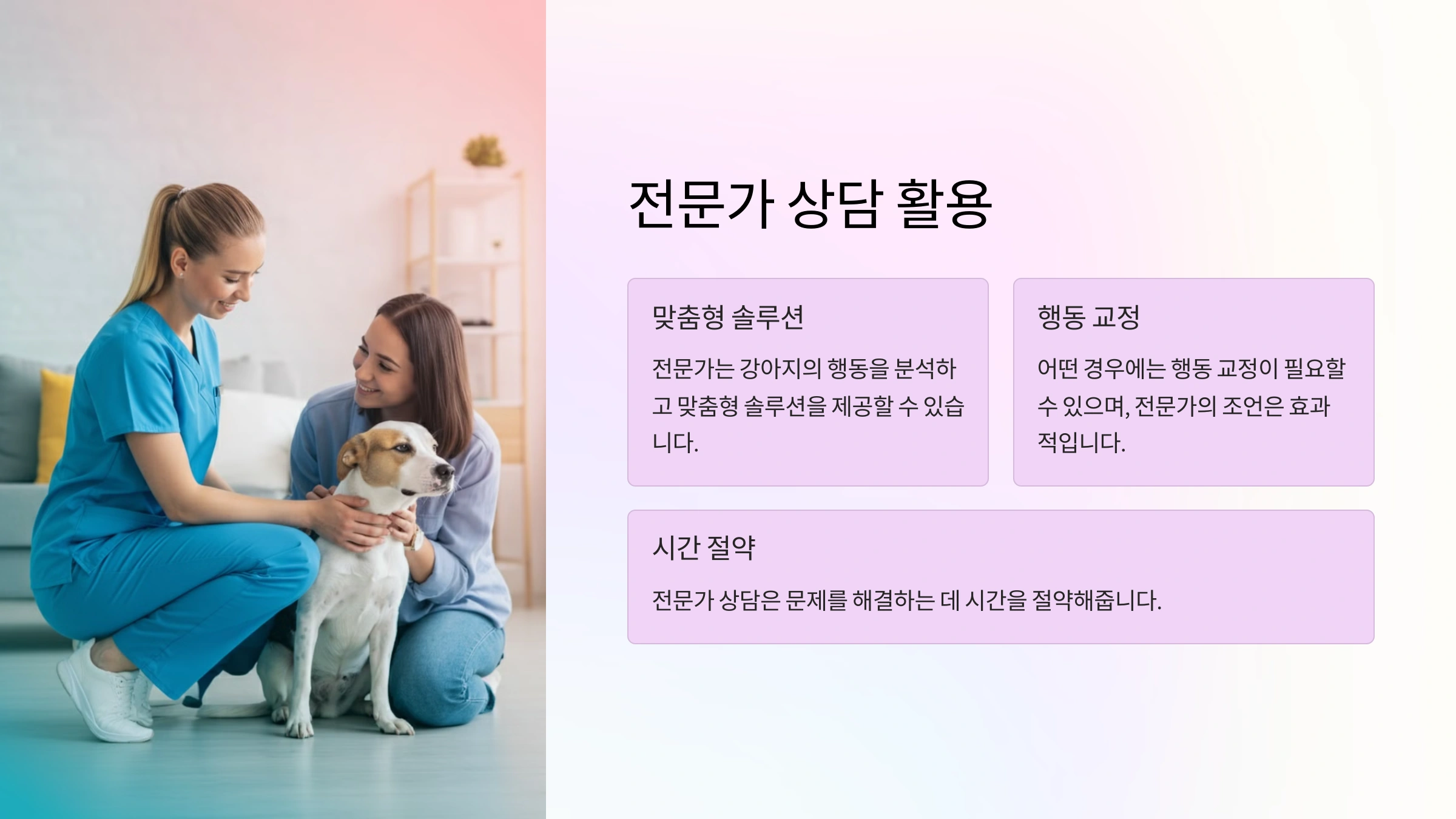 전문 상담은 짖음 문제를 보다 빠르고 효과적으로 해결할 수 있도록 도와주며, 반려인에게도 올바른 훈련 방법과 강아지를 이해하는 데 필요한 지식을 전달합니다.