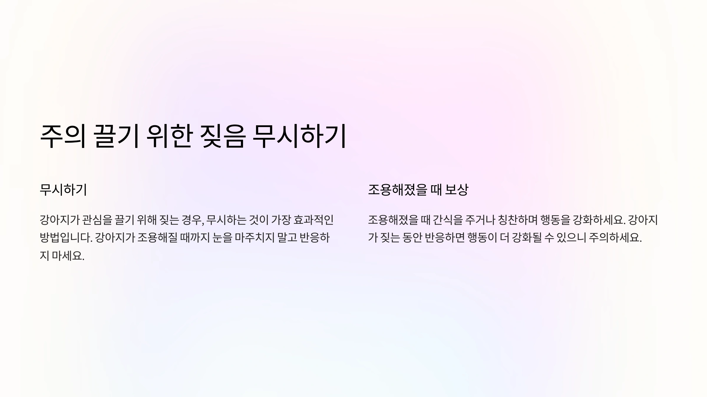 주의를 끌기 위한 짖음은 보통 반려인의 반응을 기대하면서 발생합니다. 짖음에 반응할 경우 강아지는 "이 행동이 효과적이다"라고 학습하게 되므로, 반응을 자제하는 것이 중요합니다.