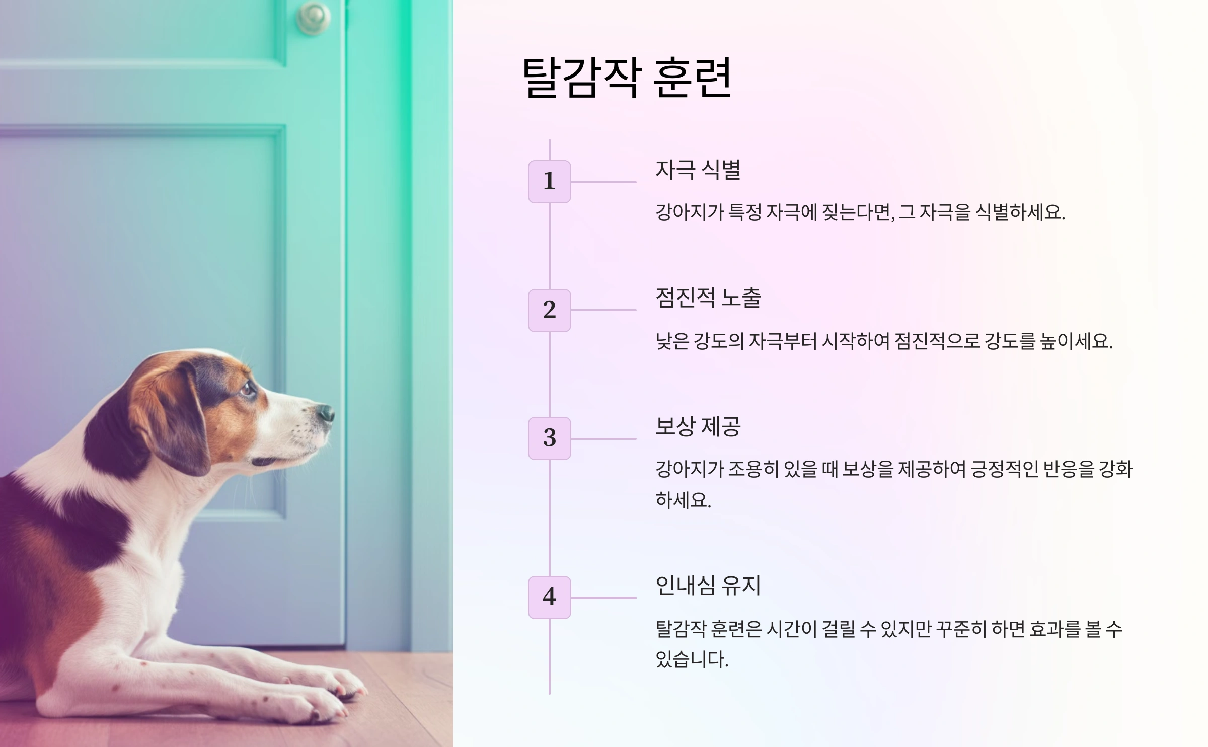 탈감작 훈련은 강아지가 자극을 받아들이는 속도에 맞춰 천천히 진행해야 하며, 강아지가 과도한 스트레스를 받지 않도록 주의해야 합니다.