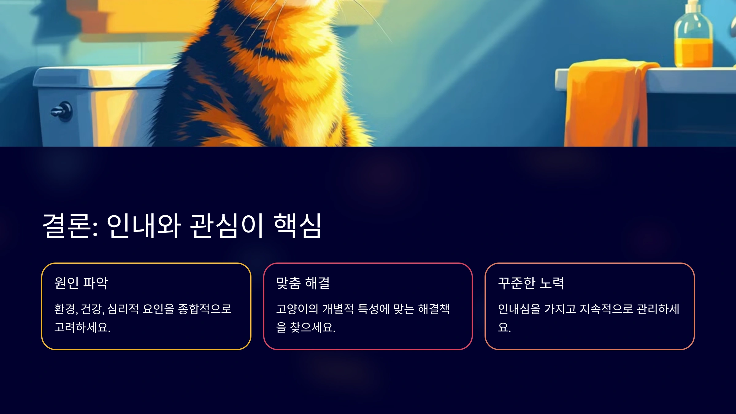 고양이가 화장실 사용을 거부하는 특정 이유가 보인다면 그 원인을 해결하며 훈련을 병행하세요. 훈련이 실패했을 때는 다시 원점으로 돌아가서 원인을 파악하고 고양이에게 맞는 방법을 적용해 주세요.