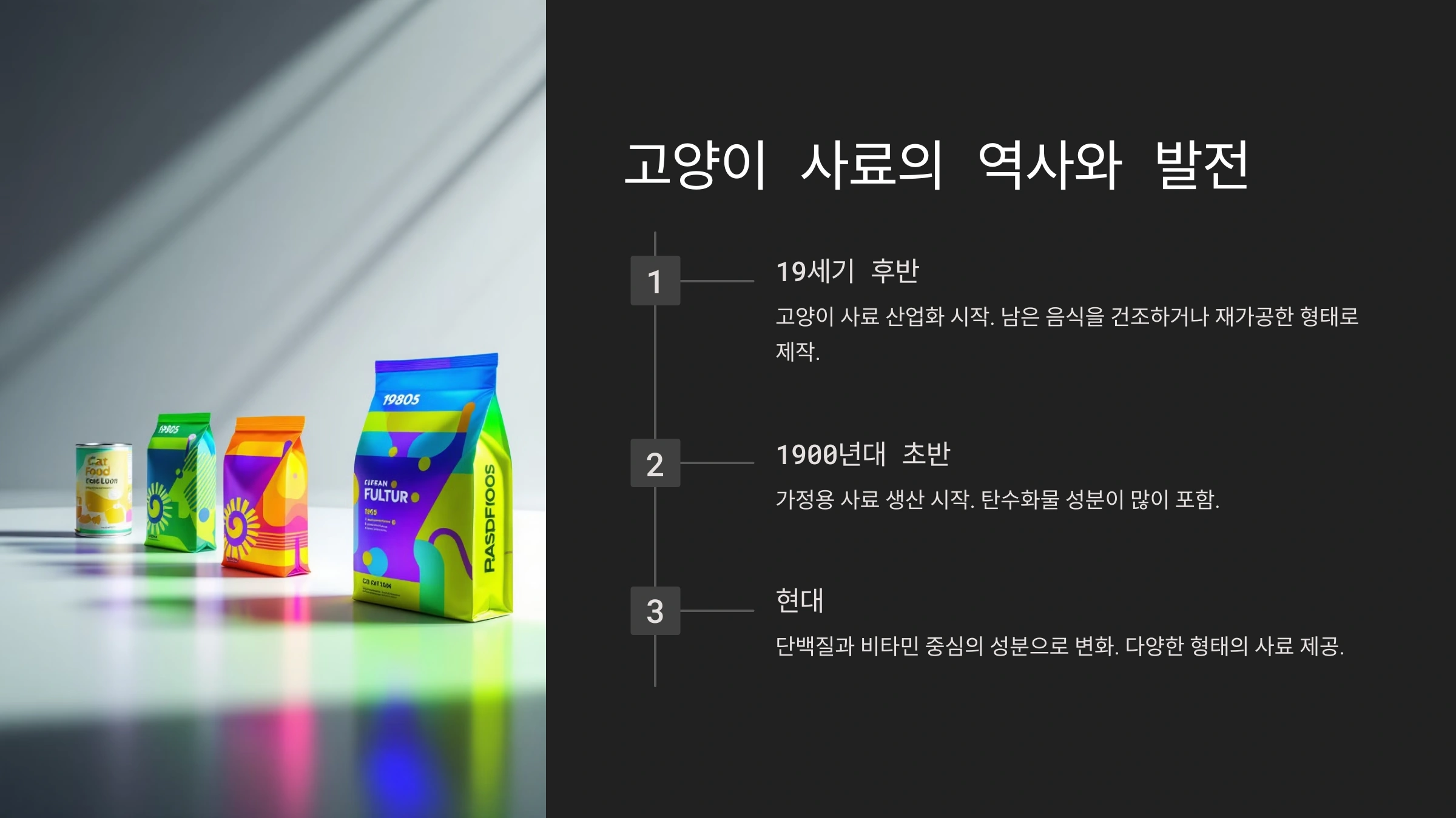 고양이 사료는 19세기 후반부터 산업화되기 시작했어요. 초기에는 남은 음식을 건조하거나 재가공한 형태로 제작되었지만, 현대의 고양이 사료는 고양이의 생리학적 요구에 맞춘 과학적 접근을 기반으로 만들어지고 있답니다.