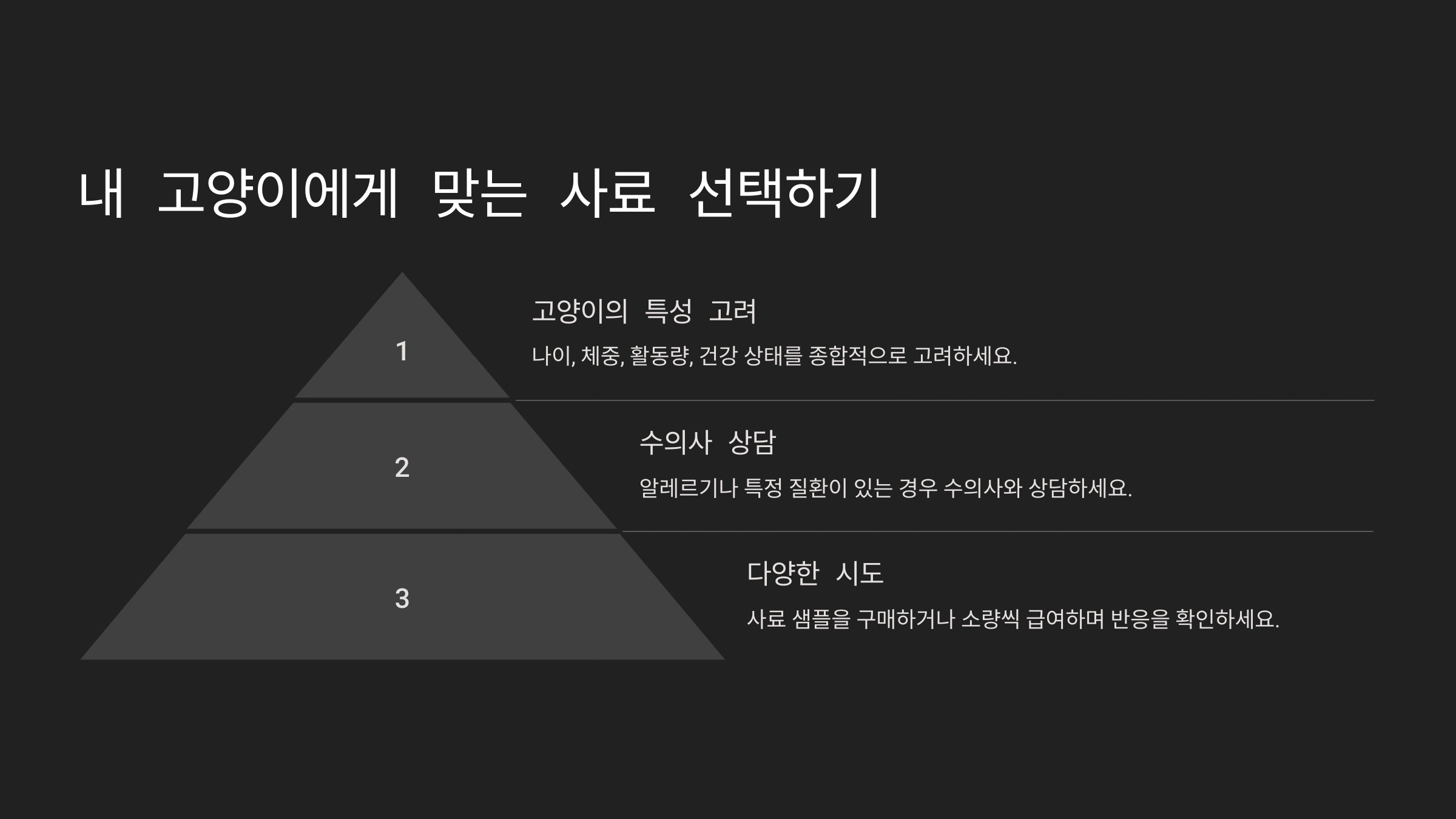 사료를 선택할 때는 고양이의 나이, 체중, 활동량, 건강 상태를 종합적으로 고려해야 해요. 예를 들어, 성장기에는 고단백 사료가 필요하고, 노령 고양이에게는 저칼로리 사료가 더 적합해요.