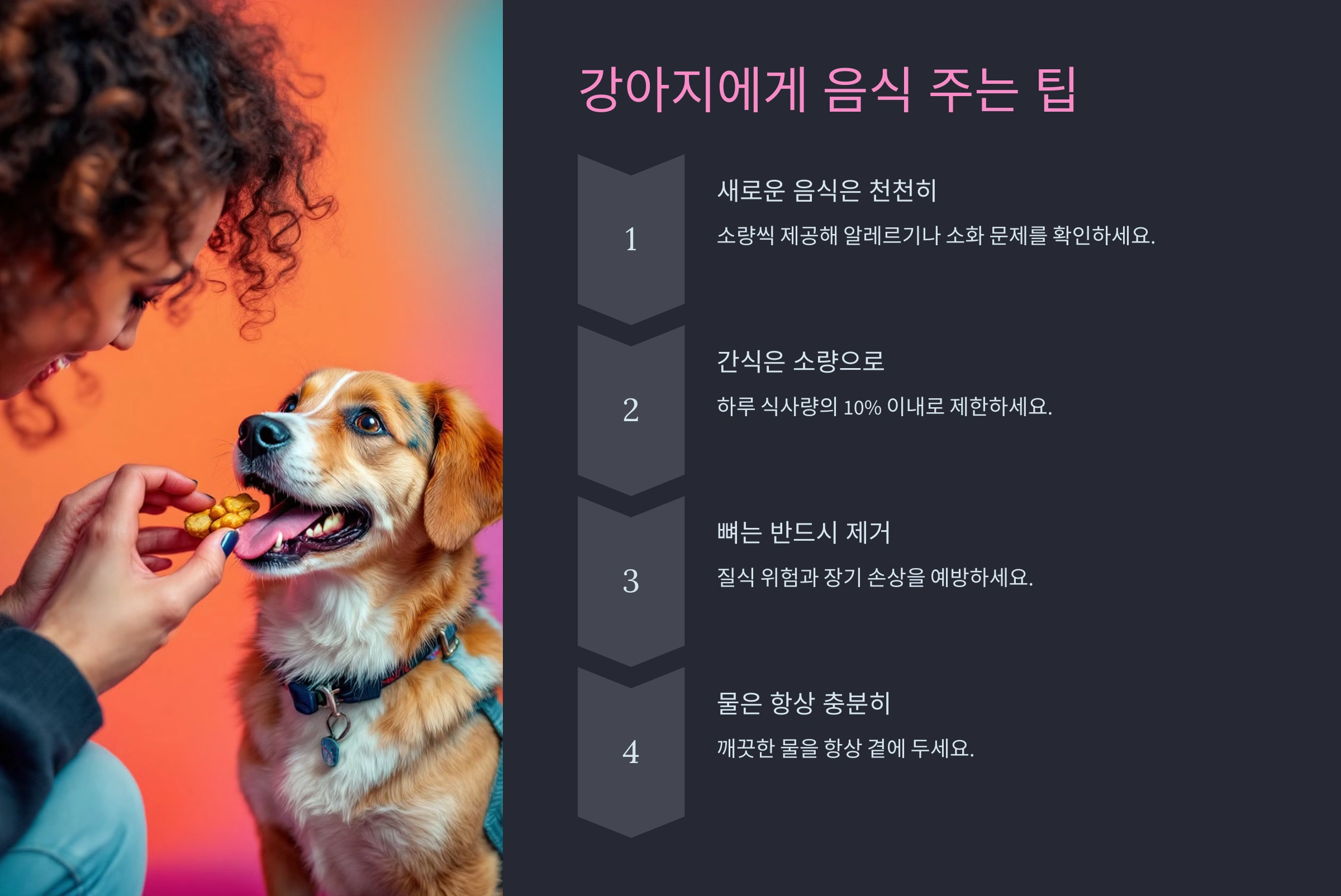 강아지에게 음식을 줄 때는 단순히 사람 음식을 나눠주는 것보다, 강아지의 건강과 습성을 고려해 안전하게 제공하는 것이 중요해요. 다음은 도움이 될 만한 팁이에요: