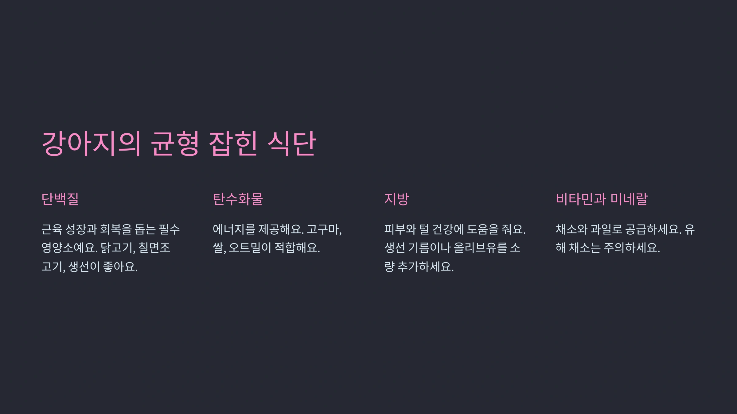 강아지의 건강을 유지하려면 균형 잡힌 식단을 제공하는 것이 중요해요. 강아지가 필요로 하는 영양소를 고르게 섭취하도록 아래 사항을 참고하세요: