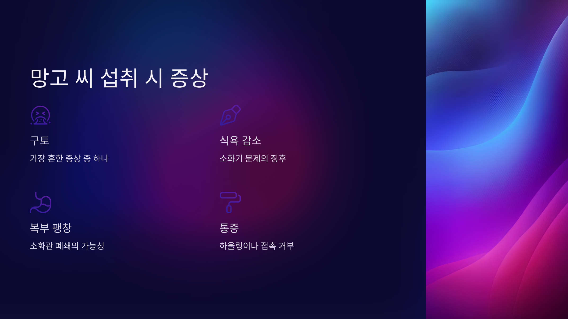 강아지가 망고 씨를 먹었을 경우, 여러 가지 증상이 나타날 수 있어요. 대표적으로 구토, 침 흘림, 식욕 감소 등이 있어요. 이런 증상은 보통 이물질이 소화기관에 걸리거나 독성 물질로 인해 나타나는 경우가 많아요.