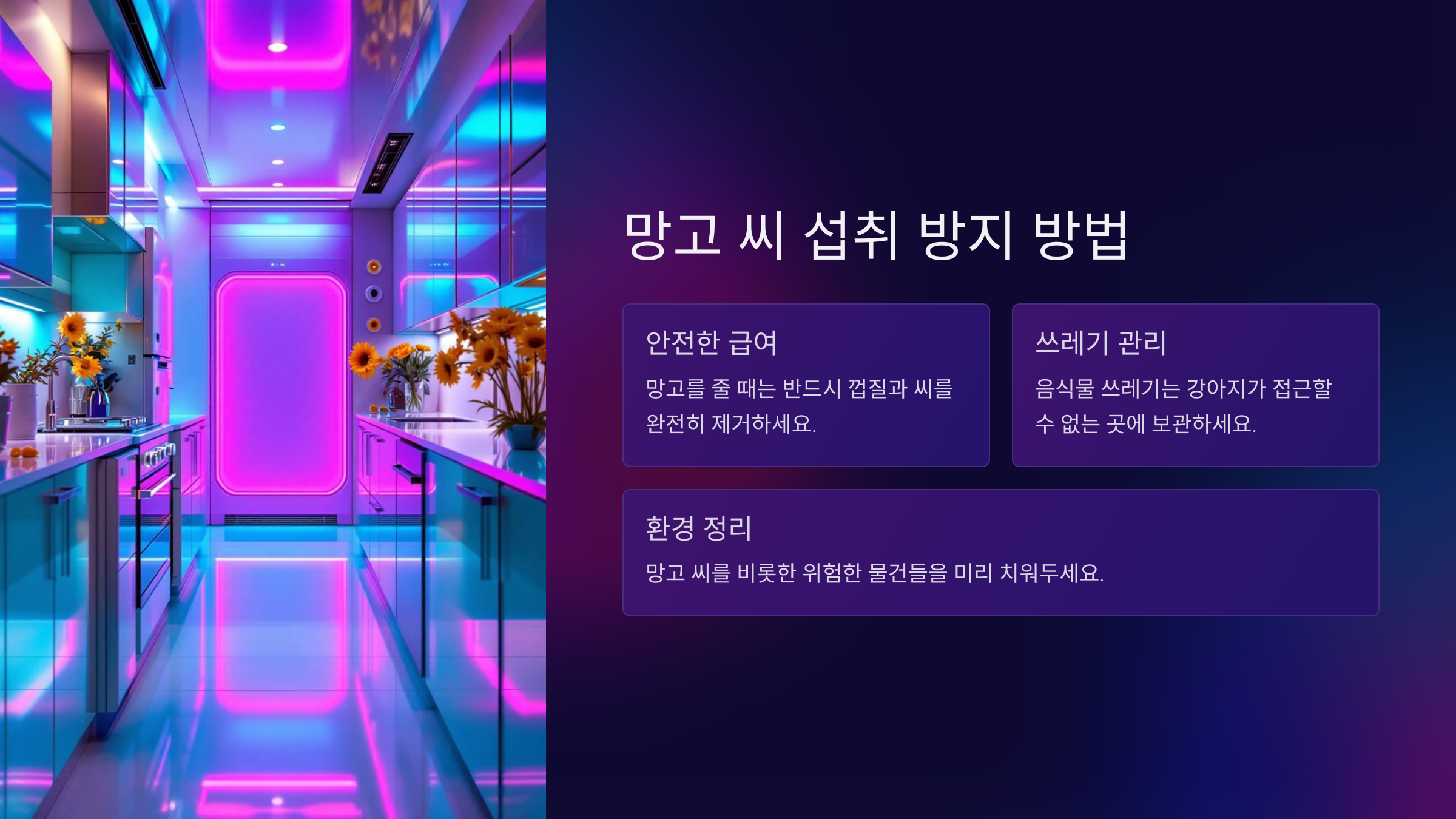 또한, 강아지가 주변에 놓인 망고 씨를 장난감처럼 물고 놀지 않도록 미리 치워주는 것이 중요해요. 호기심이 많은 강아지일수록 이런 상황에 주의가 필요하답니다.
