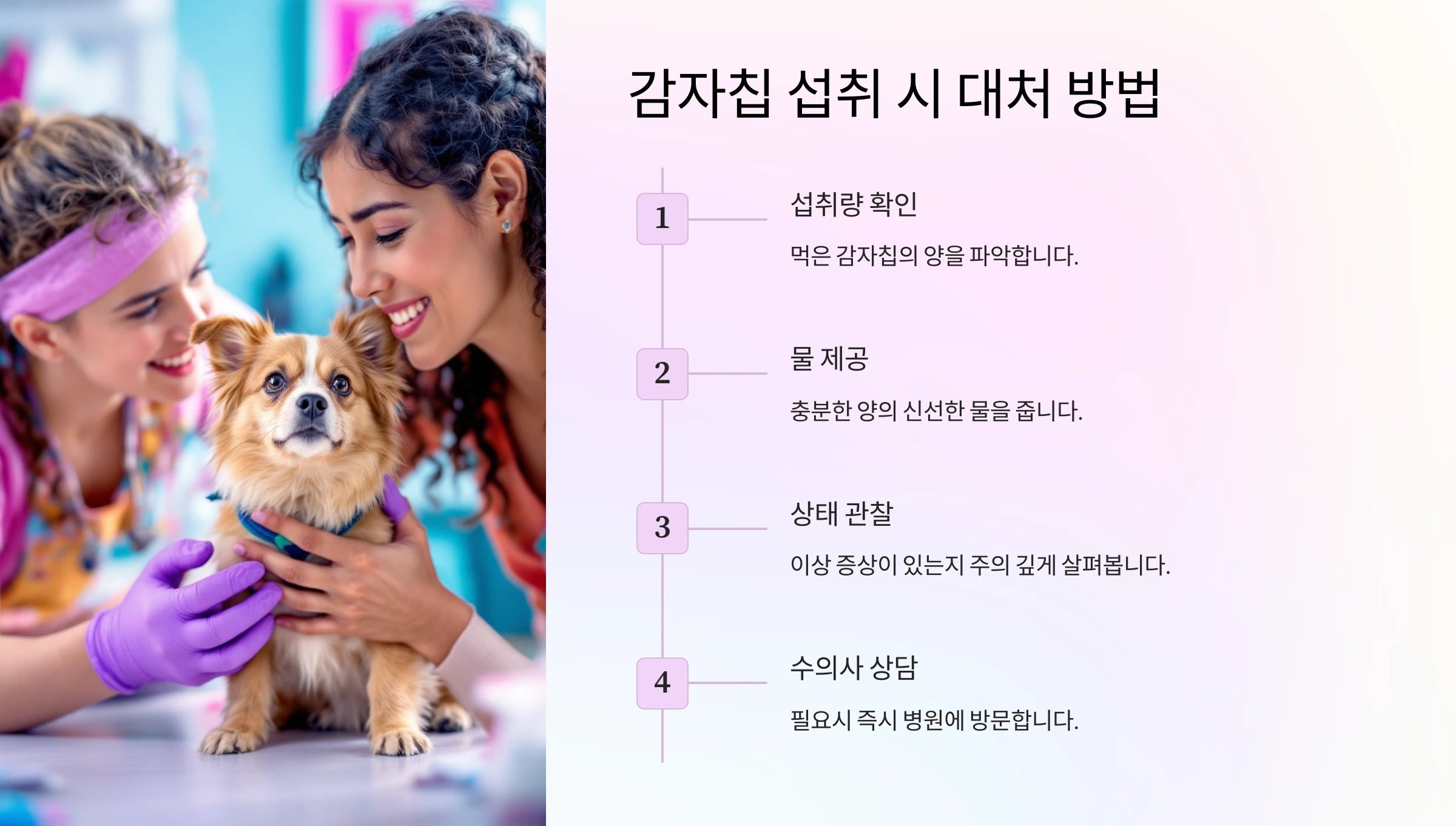 강아지가 감자칩을 먹었다면 즉시 상태를 확인하고 적절한 조치를 취하는 것이 중요해요. 특히 작은 강아지나 기존에 신장 질환이 있는 강아지는 빠르게 대응해야 해요.