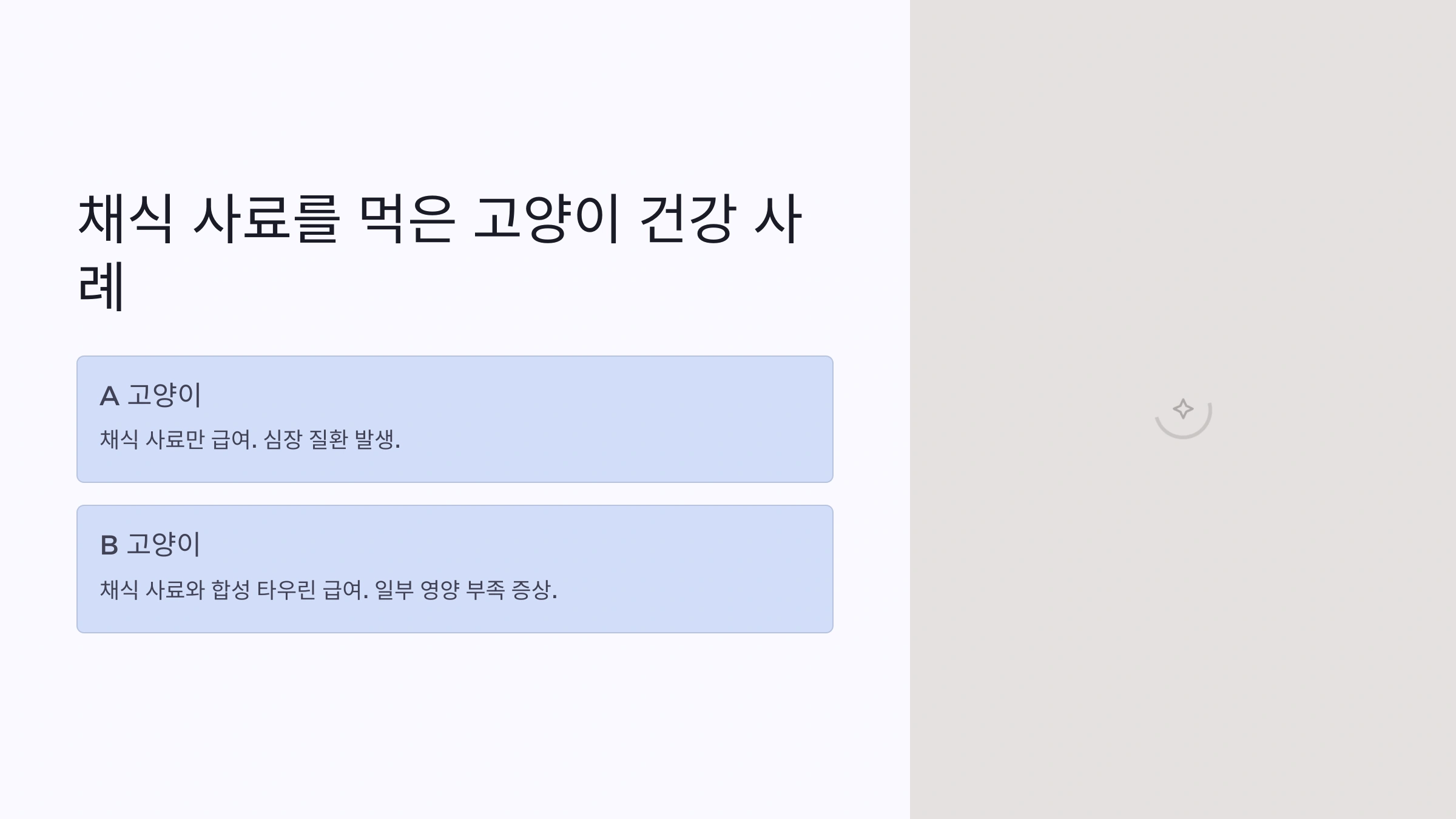 | A 고양이 | 채식 사료만 급여 | 심장 질환 발생 |