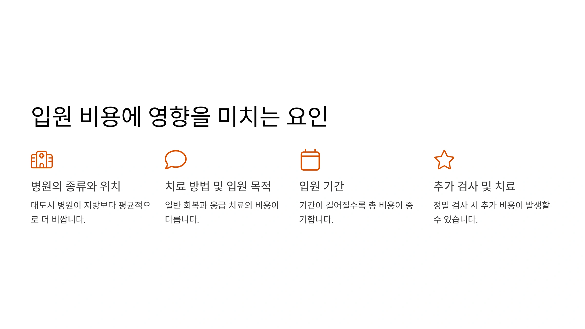 일반적인 회복 목적의 입원과 응급 치료가 필요한 경우 비용이 다르게 책정돼요. 수술 후 집중 치료가 필요한 경우 ICU(집중치료실) 비용이 추가될 수 있어요.