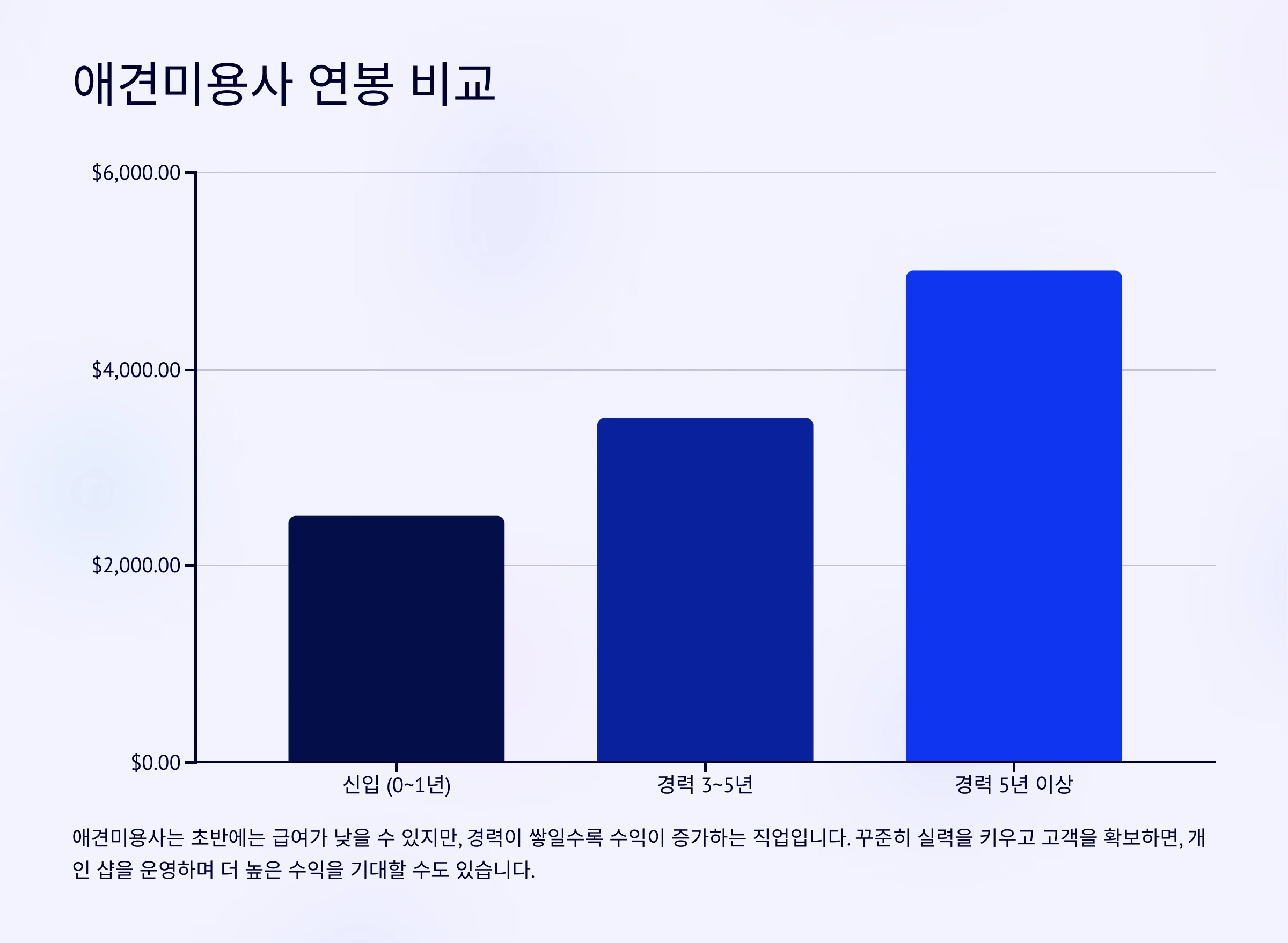 애견미용사는 초반에는 급여가 낮을 수 있지만, 경력이 쌓일수록 수익이 증가하는 직업이에요. 꾸준히 실력을 키우고 고객을 확보하면, 개인 샵을 운영하며 더 높은 수익을 기대할 수도 있어요. 🏆