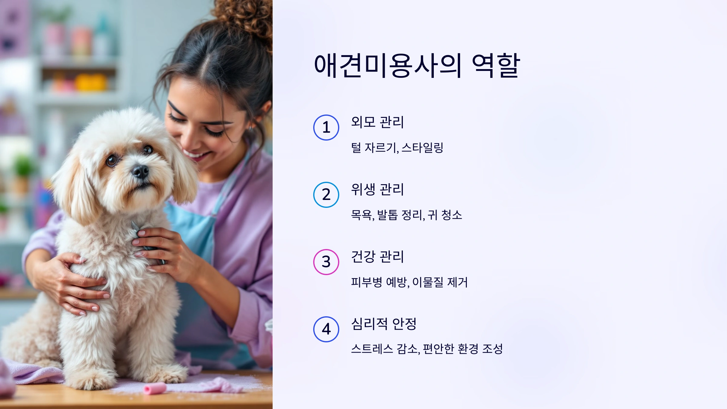 애견미용사는 단순히 예쁘게 미용하는 것뿐만 아니라, 반려동물과의 신뢰를 쌓고 건강한 생활을 돕는 역할도 한다는 점을 꼭 기억해야 해요.🐾