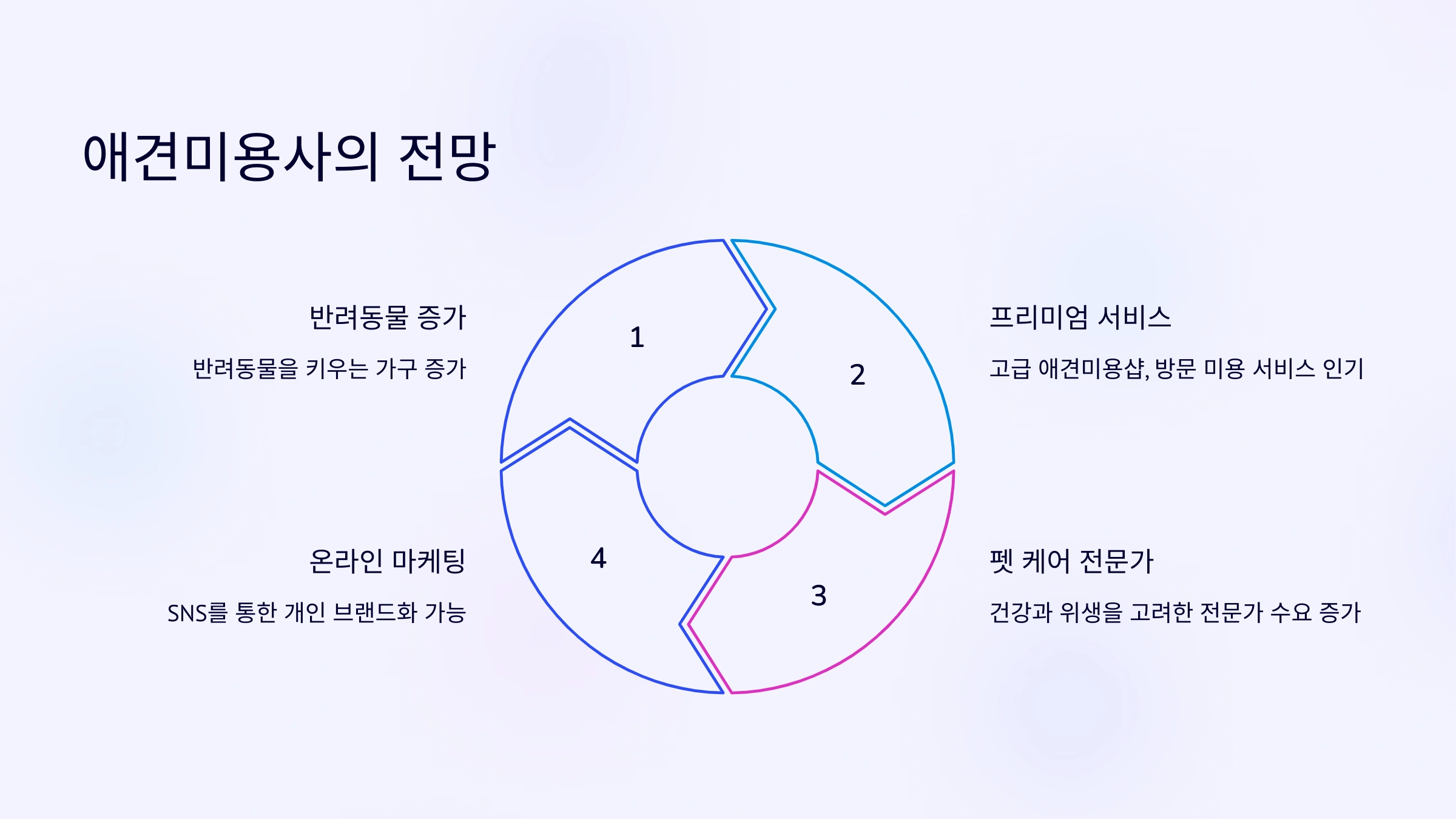 반려동물을 키우는 가구가 늘어나면서 애견미용사의 전망도 밝아요. 특히 프리미엄 반려동물 관리 서비스에 대한 관심이 커지면서, 고급 애견미용샵이나 방문 미용 서비스도 인기를 끌고 있어요.