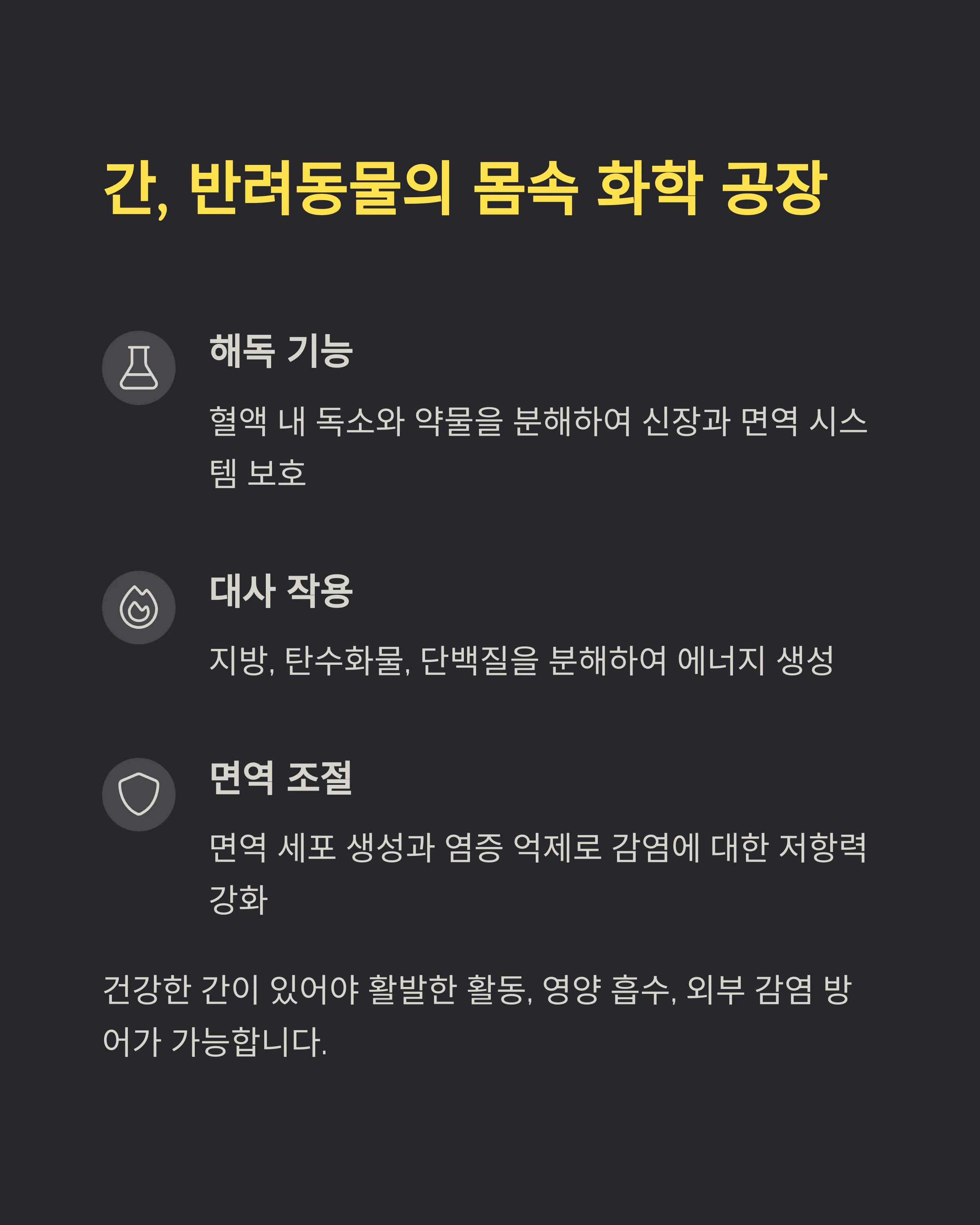 건강한 간이 있어야 **피로 없이 활발히 활동하고, 영양을 제대로 흡수하며, 외부 감염에도 잘 버틸 수 있어요.** 하지만 간은 손상이 되더라도 조용히 진행되기 때문에 보호자가 뒤늦게 알게 되는 경우가 많죠.