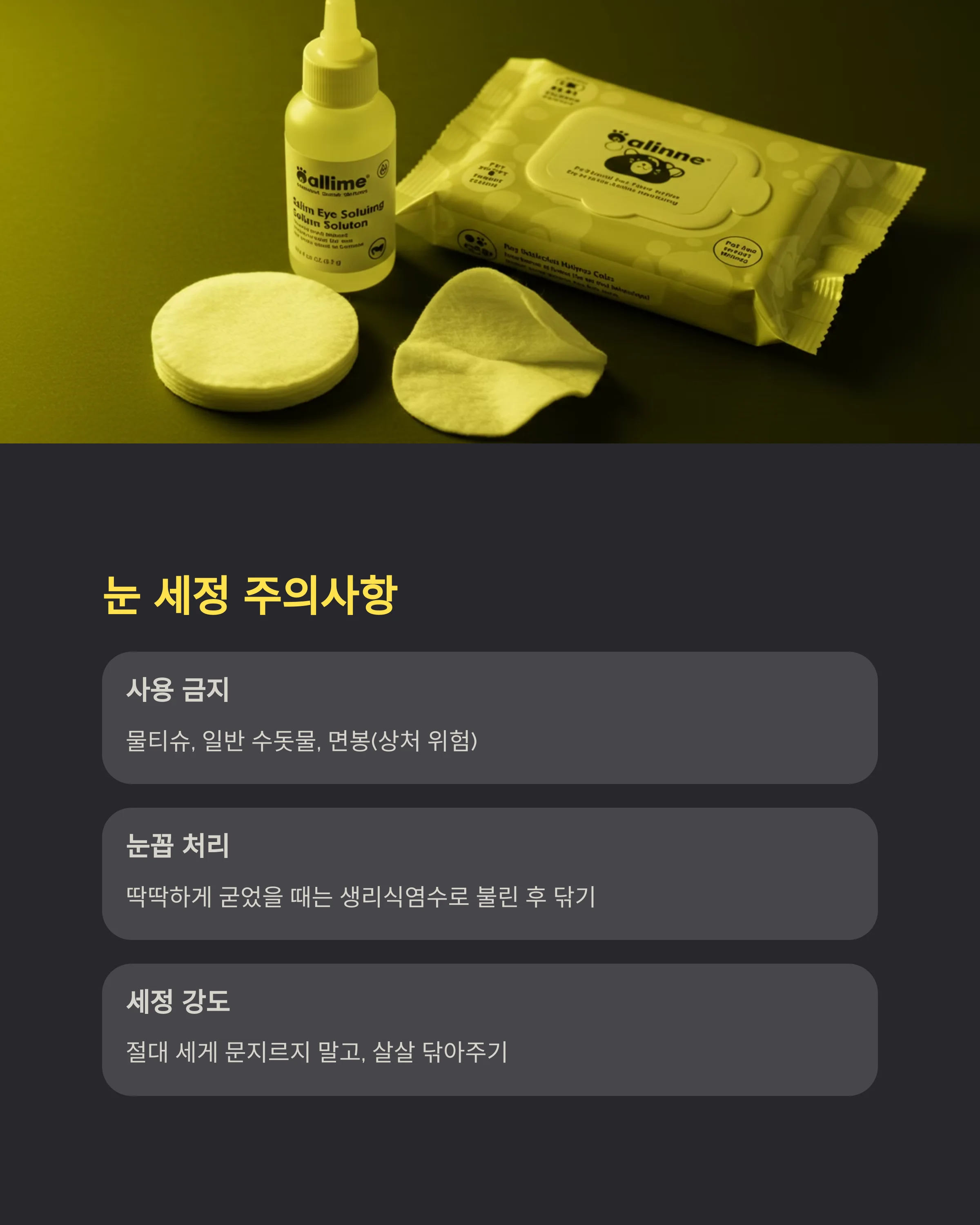 눈 주변을 닦을 때는 반려동물 전용 눈 세정제나 멸균 생리식염수를 사용해야 해요. 면봉보다는 부드러운 거즈나 화장솜을 사용하는 게 좋고, 한 번 쓴 거즈는 다시 사용하지 않도록 주의해요.