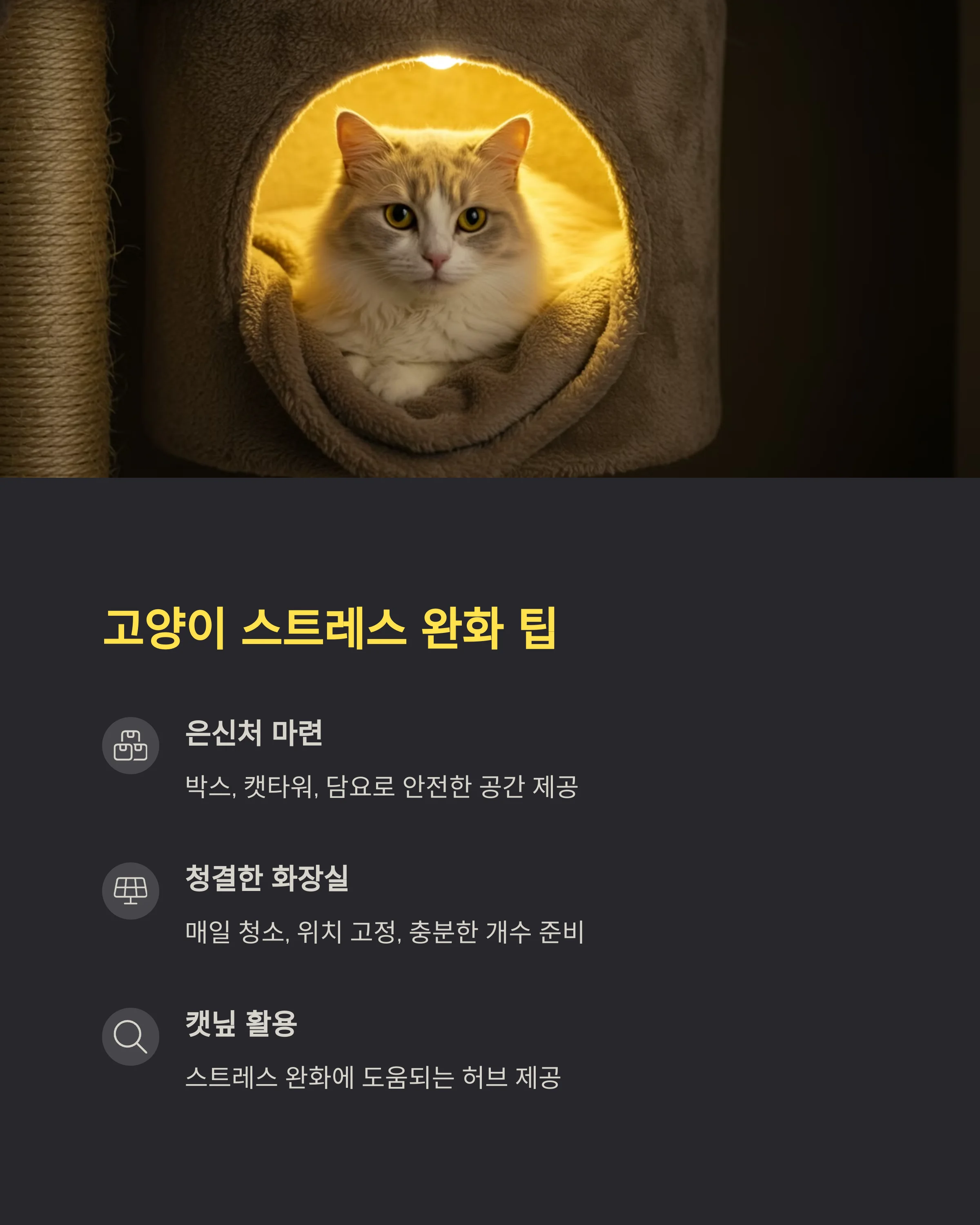 먼저 가장 중요한 건 **안정된 환경**이에요. 소음이 적고, 아이가 숨을 수 있는 공간이 있고, 일상이 크게 변하지 않는 것만으로도 큰 안정감을 줄 수 있어요. 고양이라면 **캣타워, 박스, 담요로 만든 은신처**가 꼭 필요하죠.