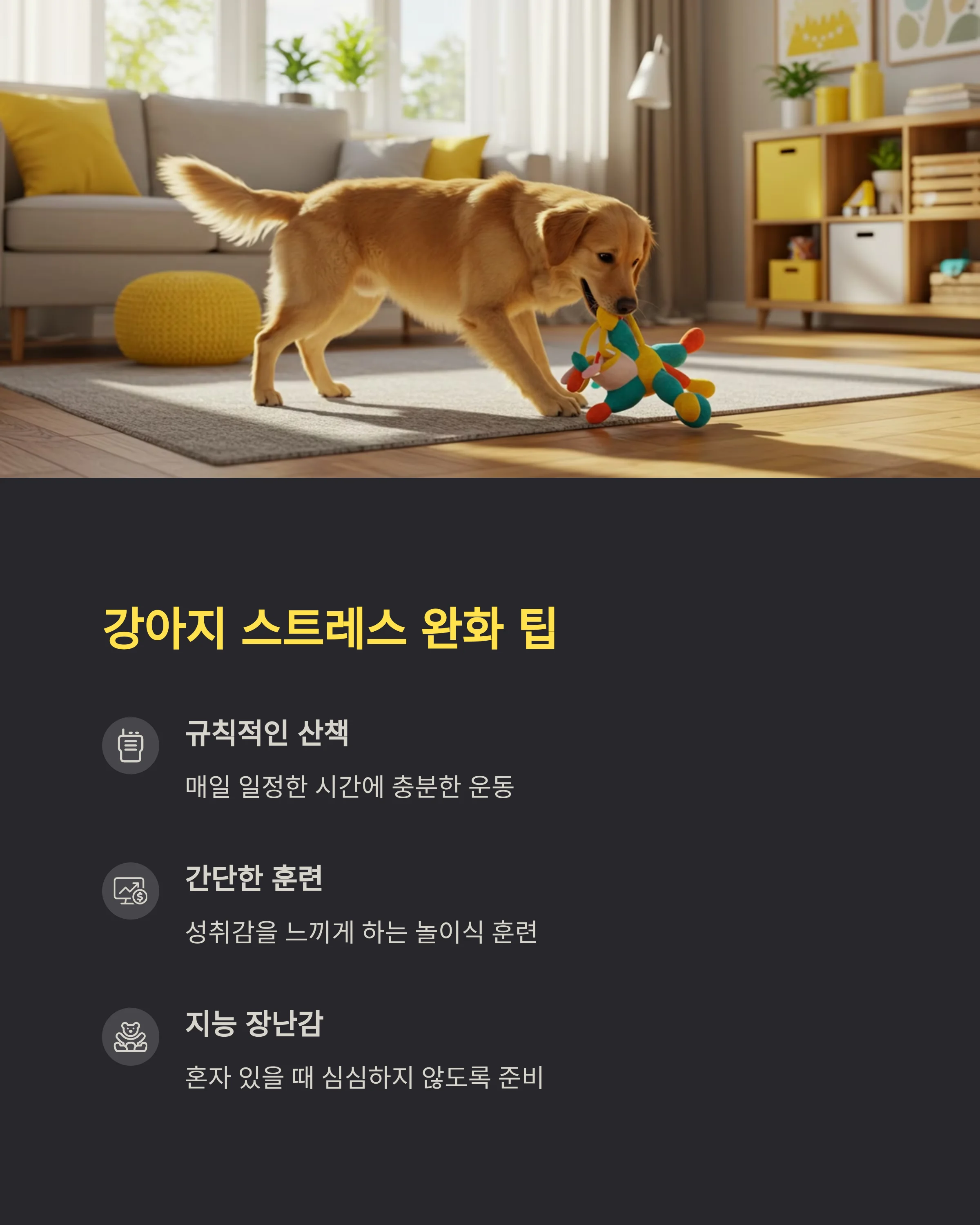 강아지에게는 **규칙적인 산책, 놀이 시간, 보호자와의 교감**이 최고예요. 매일 일정한 시간에 산책하고, 간단한 훈련을 통해 성취감을 느끼게 해주면 스트레스에 훨씬 강해져요. 간식 보상은 잊지 말고요! 🐕🦴