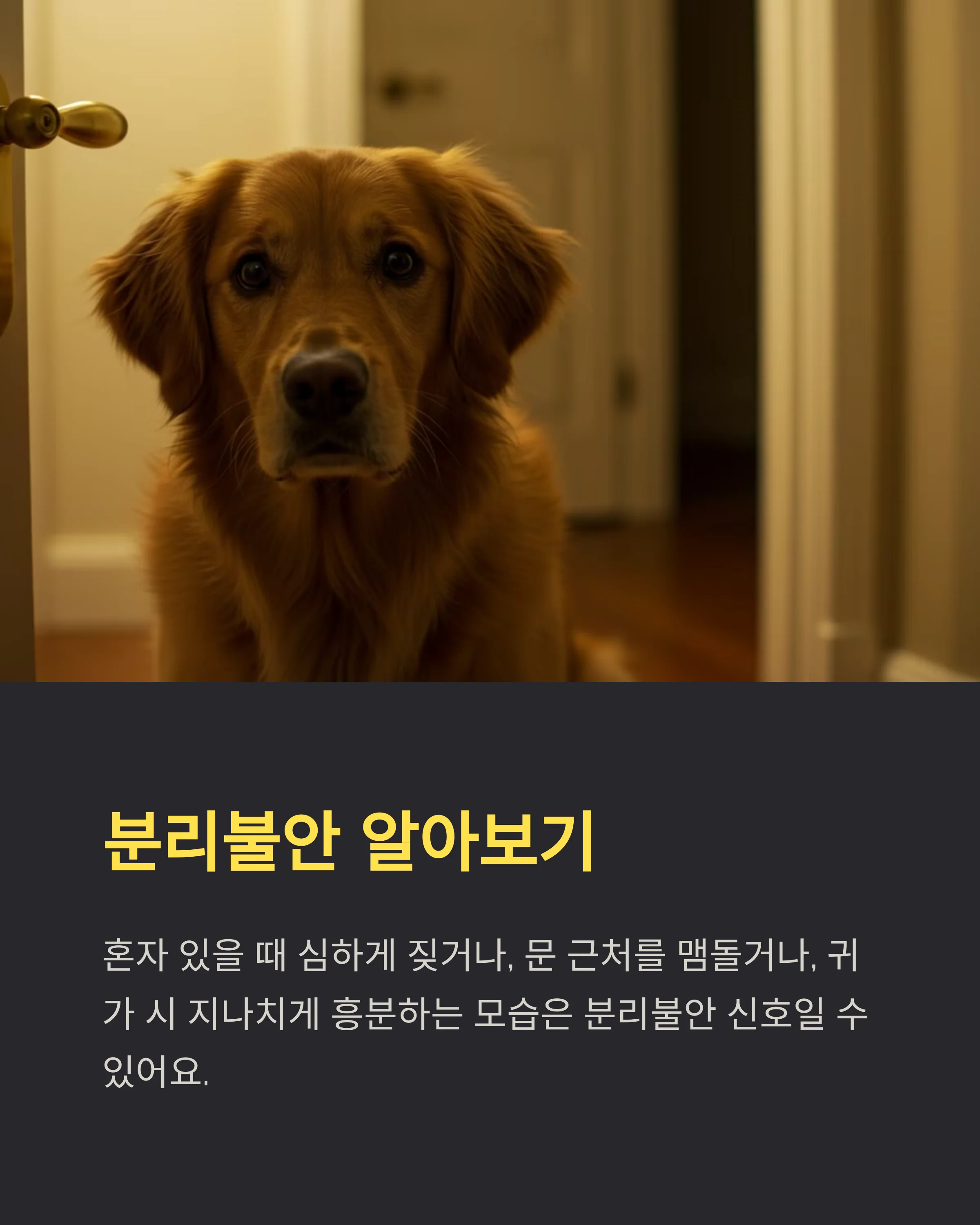 사람이 없는 집에 혼자 있을 때 심하게 짖거나, 문 근처를 계속 맴돌거나, 보호자가 귀가했을 때 지나치게 흥분하는 모습은 **분리불안 가능성**이 높아요. 이 경우 단순히 외출 시간을 줄이기보다 **점진적인 훈련과 보완**이 필요해요. 🧘♂️