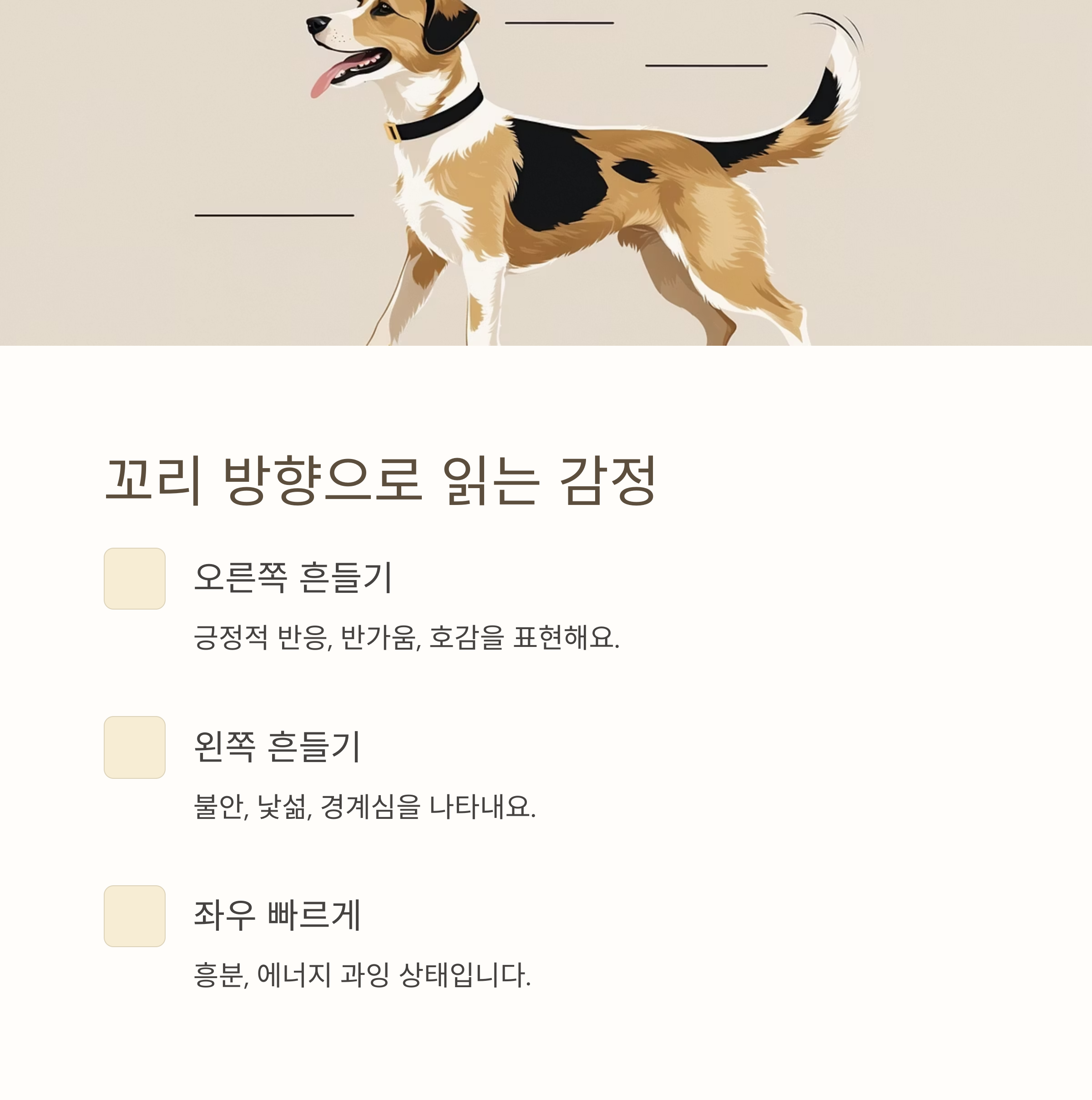 사람이 얼굴 표정으로 감정을 표현하듯, 강아지는 꼬리의 방향, 움직임, 높이, 속도로 기분을 전달해요. 보호자가 이를 이해하면 강아지의 신호를 오해하지 않고 더 깊이 교감할 수 있어요.
