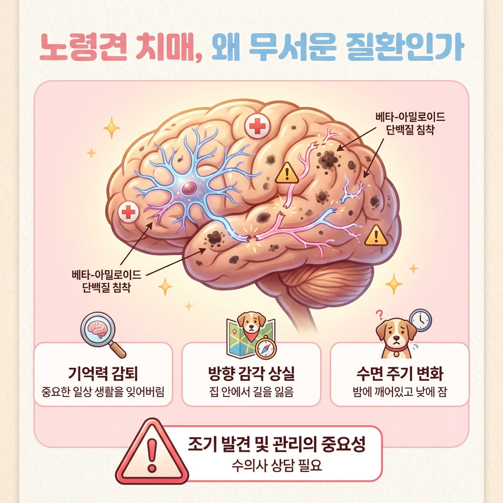 인지기능장애증후군(CCD)은 단순한 "건망증"이 아니에요. 뇌 속 도파민이라는 신경전달물질이 고갈되고, 동시에 베타아밀로이드 단백질이 뇌 조직 곳곳에 침착되면서 발생하는 퇴행성 신경 질환이거든요. 이 과정에서 뇌 자체가 물리적으로 위축되기 때문에, 한번 시작되면 되돌릴 수 없는 비가역적 변화가 일어나요.